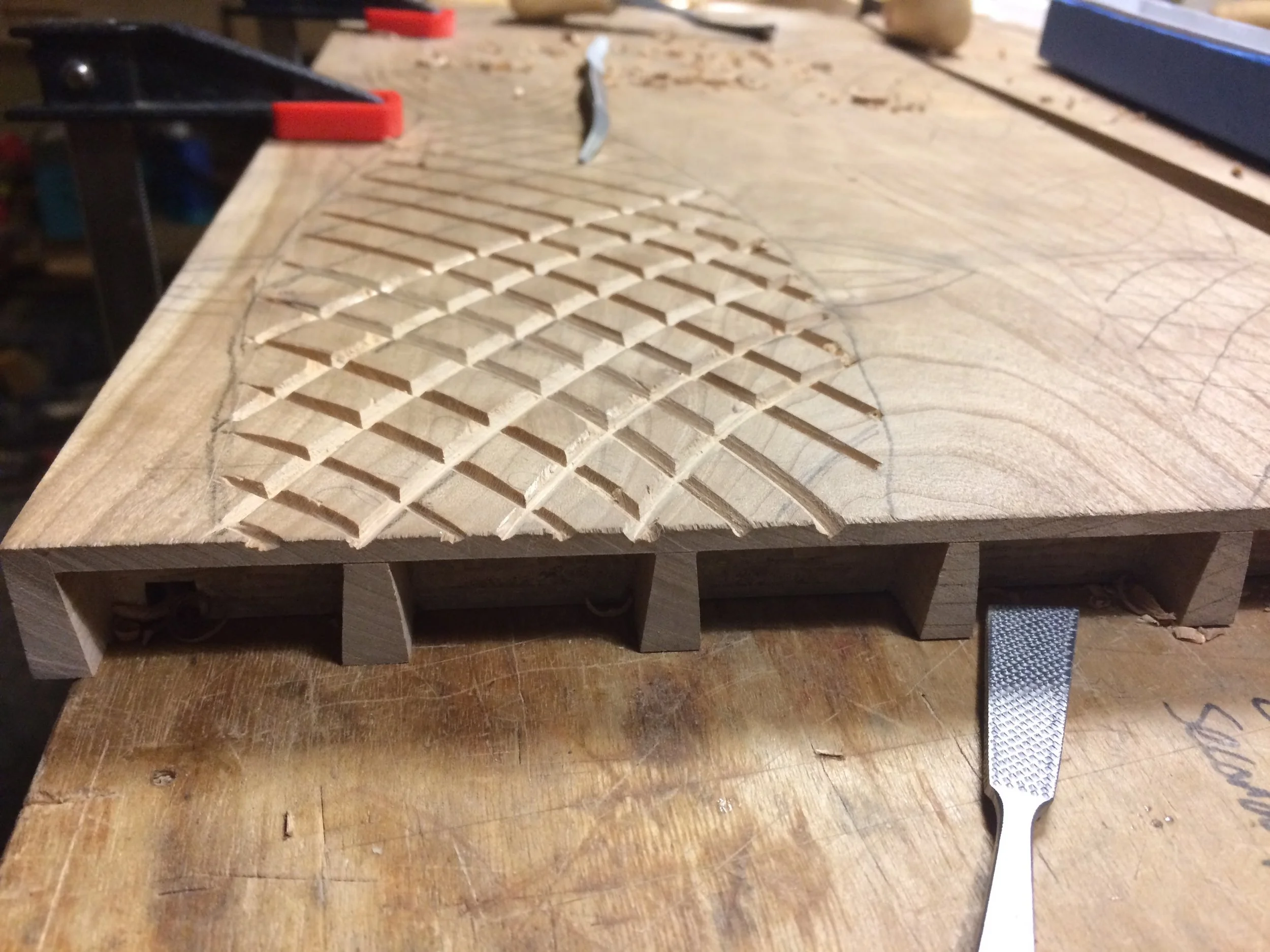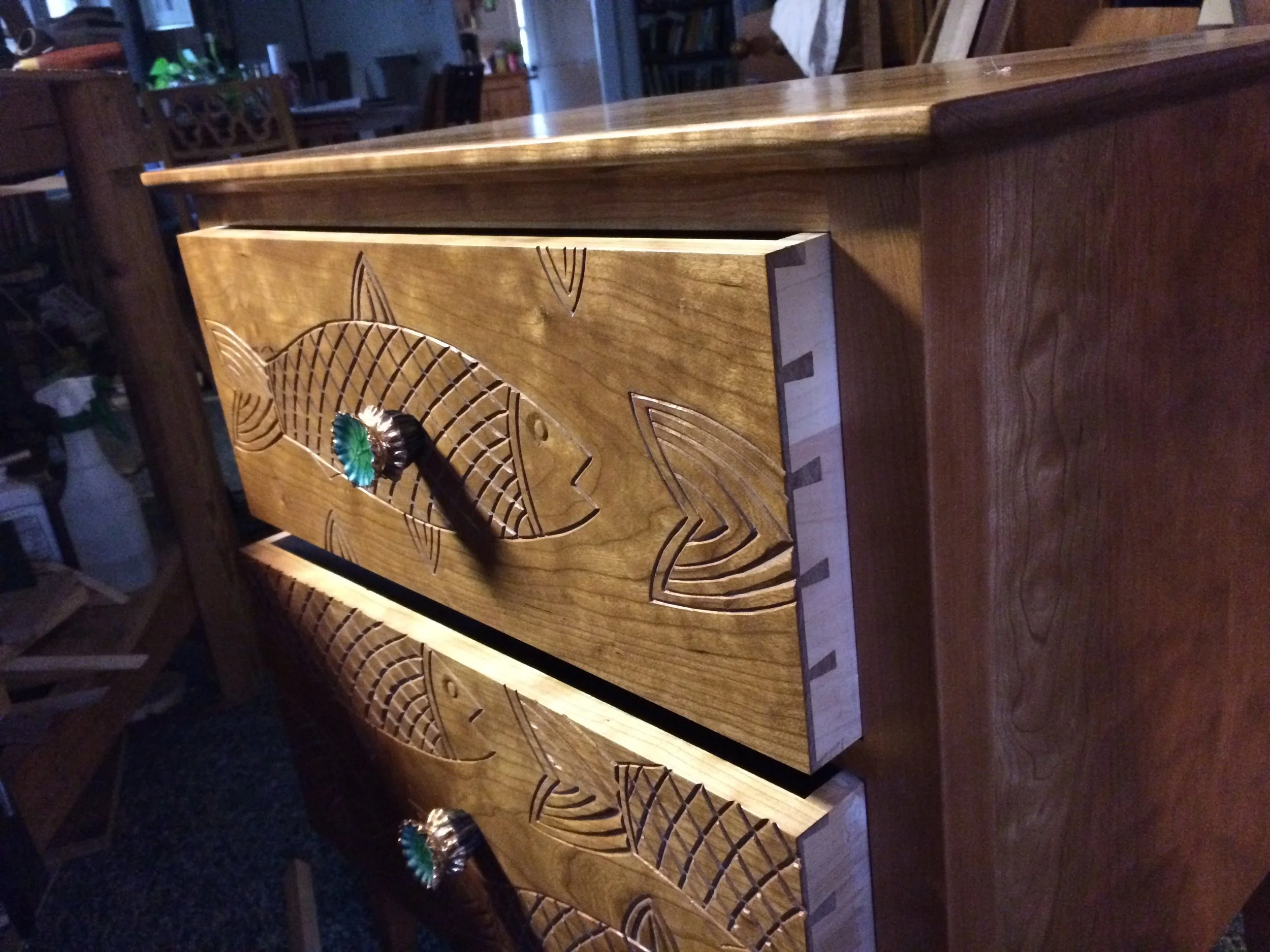 Cabinet with carved fish on the doors and hand joinery